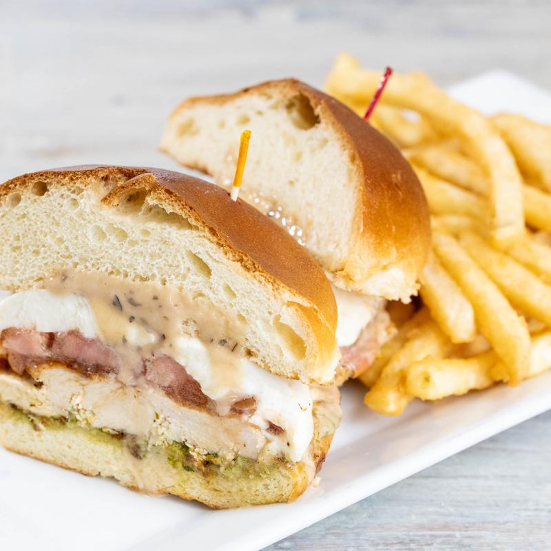 Grilled chicken on toasted brioche with fresh mozzarella, tomato, pesto and balsamic dressing.