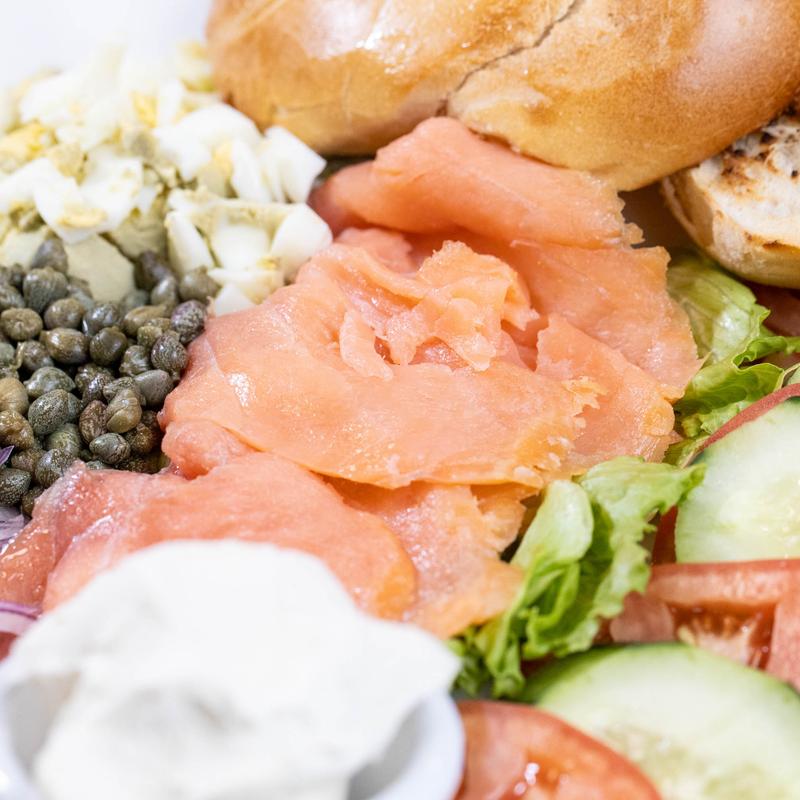 • Smoked Salmon, Hard Boiled Egg, Capers, Red Onion, Tomato, Lettuce, Cucumber & Cream Cheese, and Assorted Bagels
